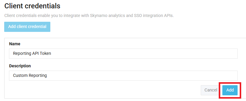 Give your Reporting API token a Name and Description (what you will be using it for, perhaps) and select Add: