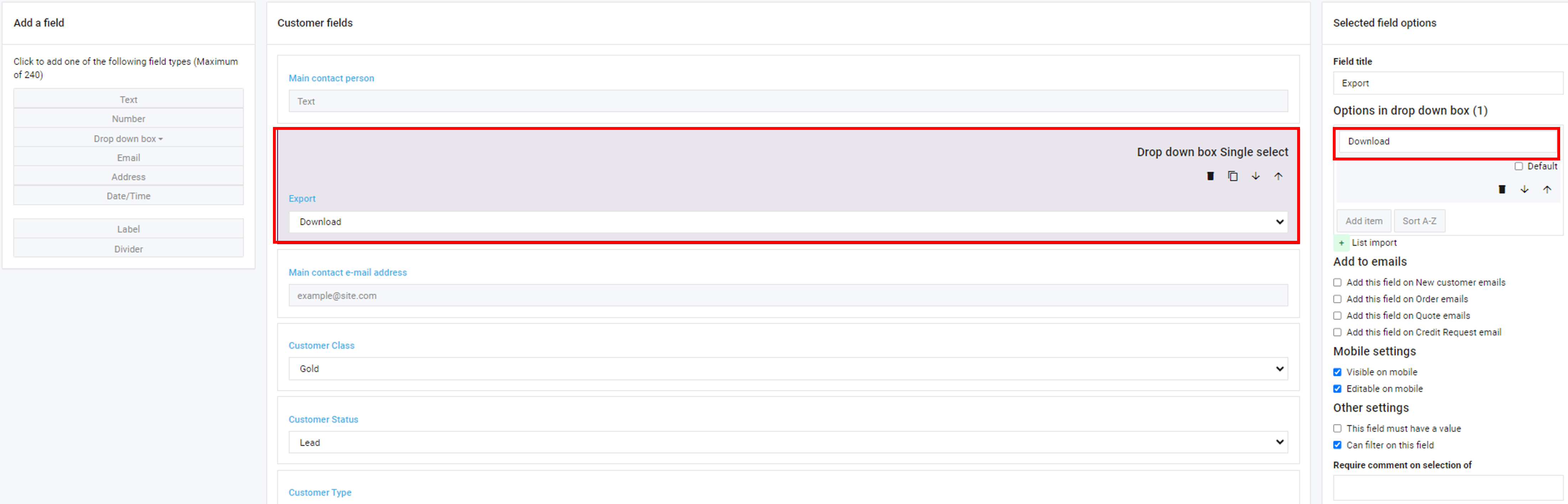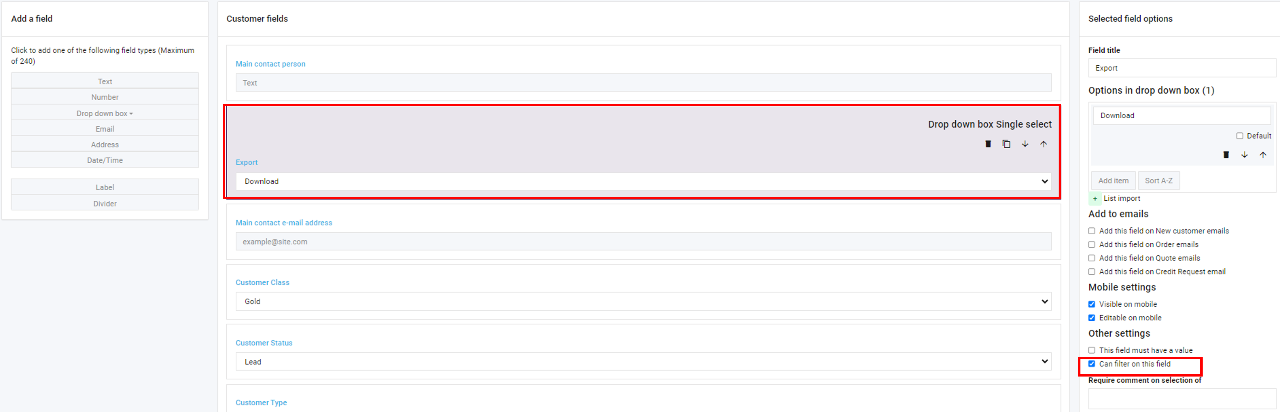 Select the "Drop down box > single select" option and name it something appropriate such export in our example below. Also, make sure you select the "can filter on this field" option: