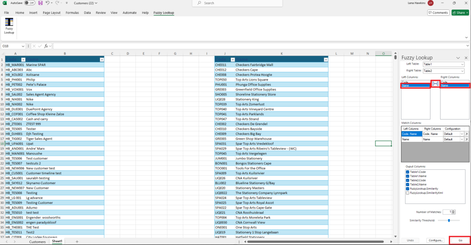 In the Fuzzy Lookup tab on the right, make sure Name and Name is selected and click the Fuzzy Lookup icon. Then, click Go:
