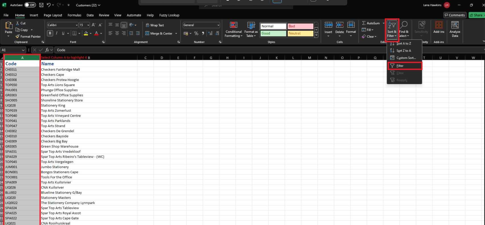 Select Column A (the Code column) and click on Sort & Filter -> Filter: