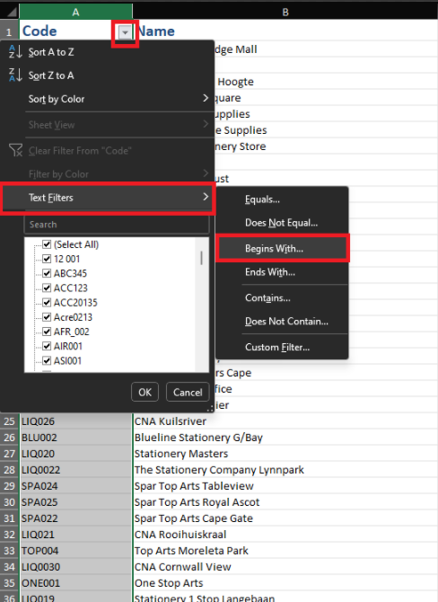Click the dropdown arrow -> Text filters -> Begins with...