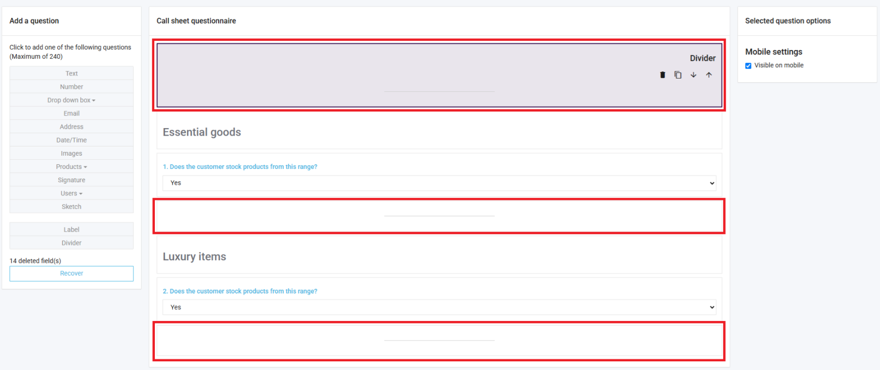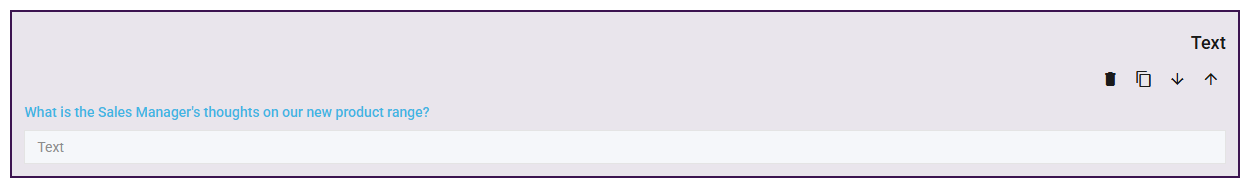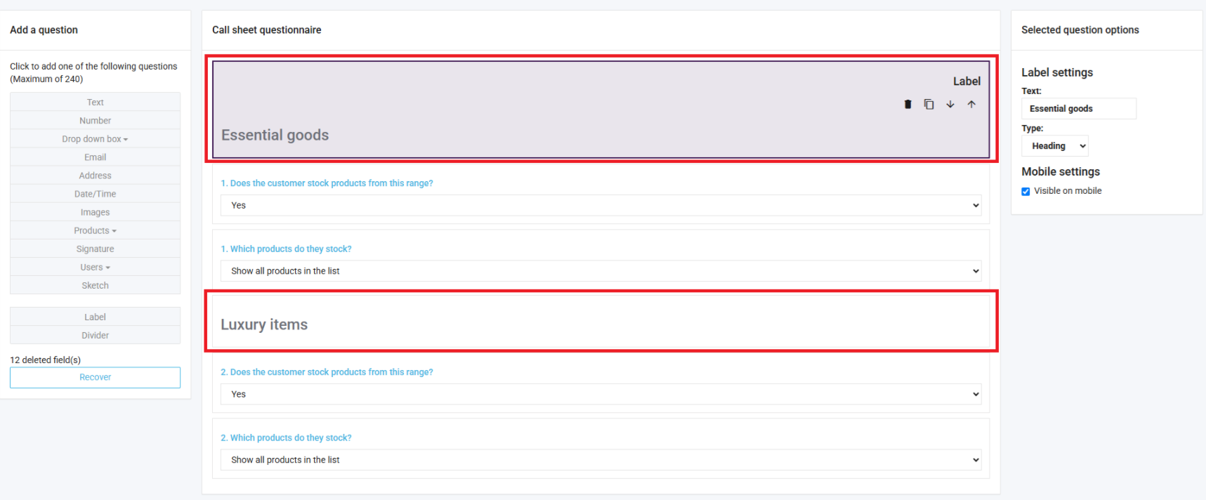 1. Heading: You can add headings for different sections of your form. For example, if you are asking questions about different product ranges, you can add headings to indicate which product range is next: