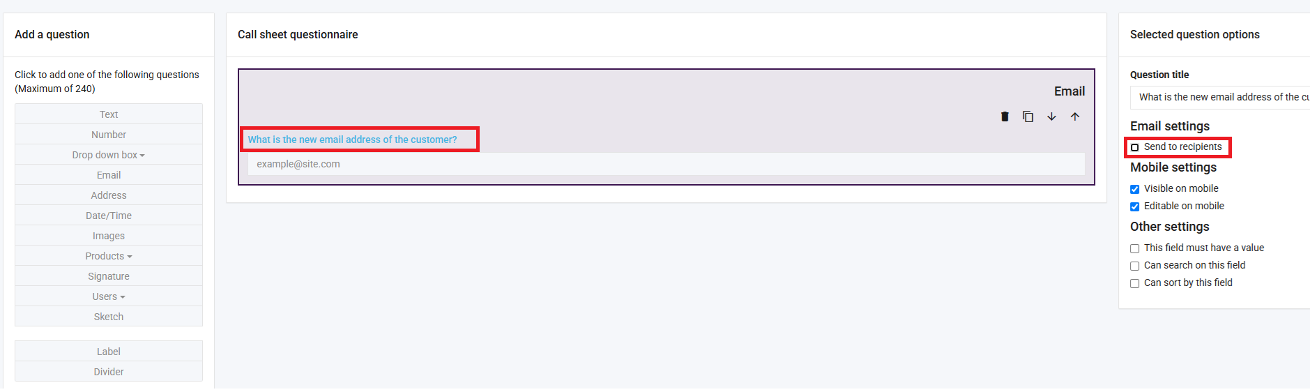 2. If the "Send to recipients" configuration is not ticked, then the field is used to gather data about email addresses. For example, you create a customer change form and the field is used to find out what the email address has changed to: