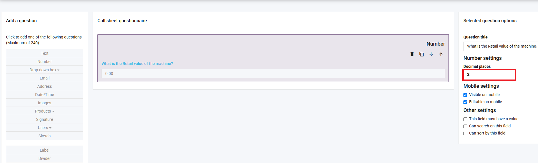 This field is used to collect data on numbers, specifically if the data includes decimals. This field is more restrictive as it only allows the user to type figures in. For example: