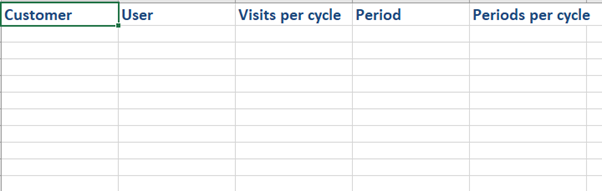 You will then choose how often you want to visit the customer per cycle. The period column is where you decide if you are setting up a weekly or monthly cycle and can only contain the values "Week" or "Month". The periods per cycle is how many weeks or months you want to plan for. To use an example, if I want to see a customer every 2 months my Period will be Month and my Periods per cycle will be 2.
