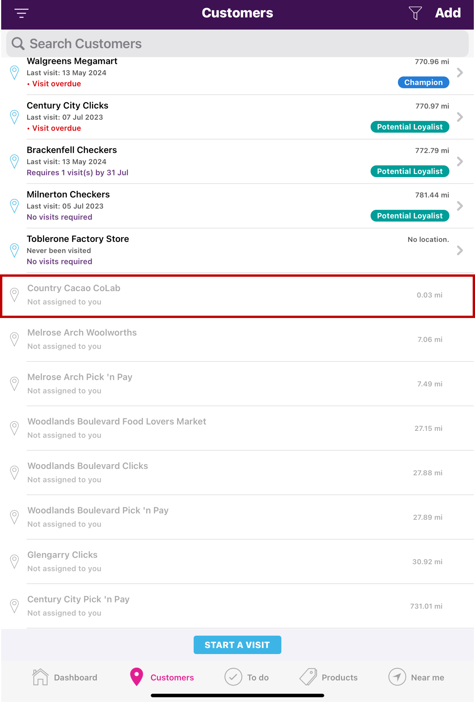 To self-assign the customers on iOS, tap on the greyed-out Customer that must be assigned to you
