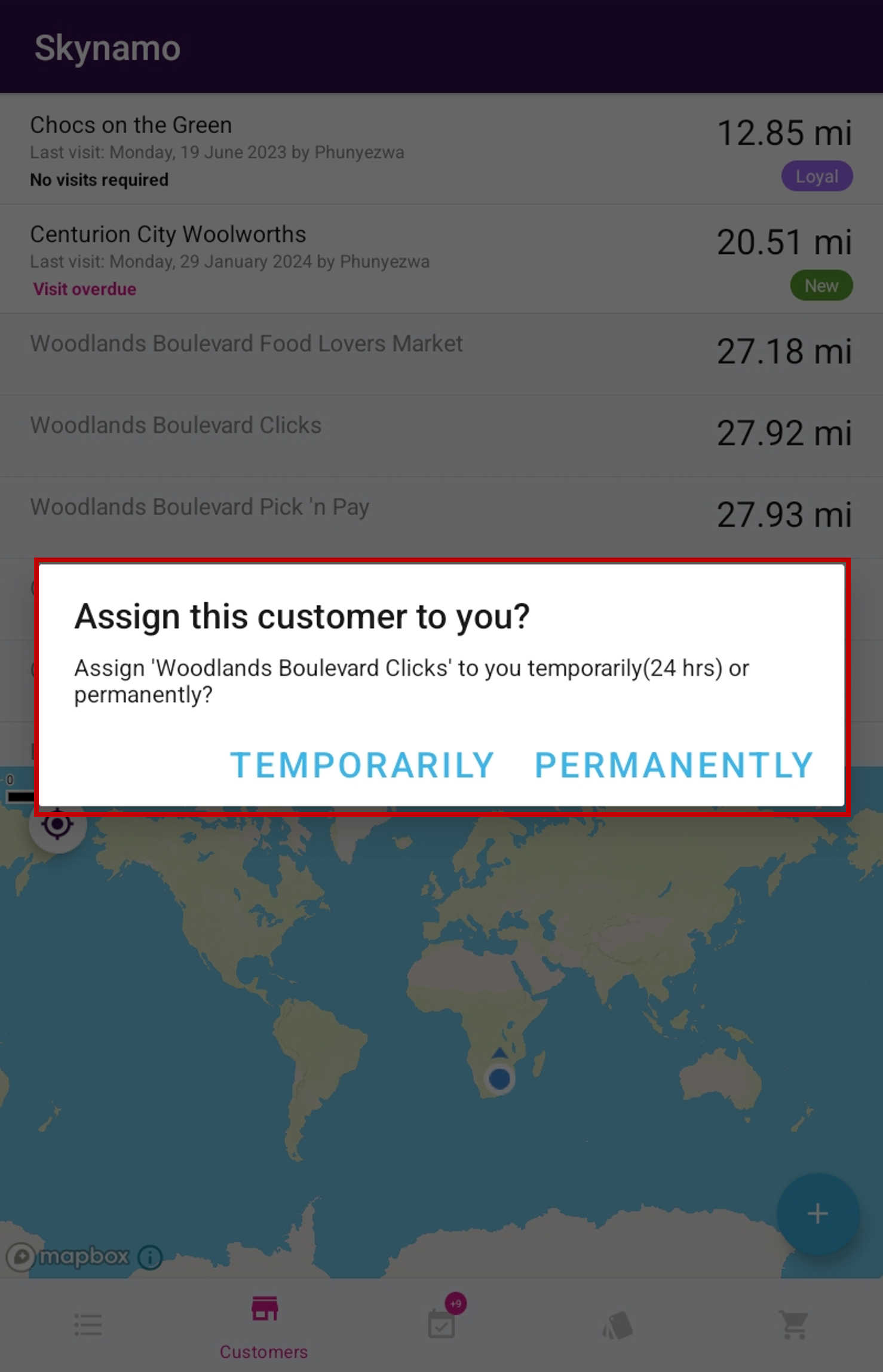 To self-assign the customers on Android, tap on the greyed-out Customer that must be assigned to you