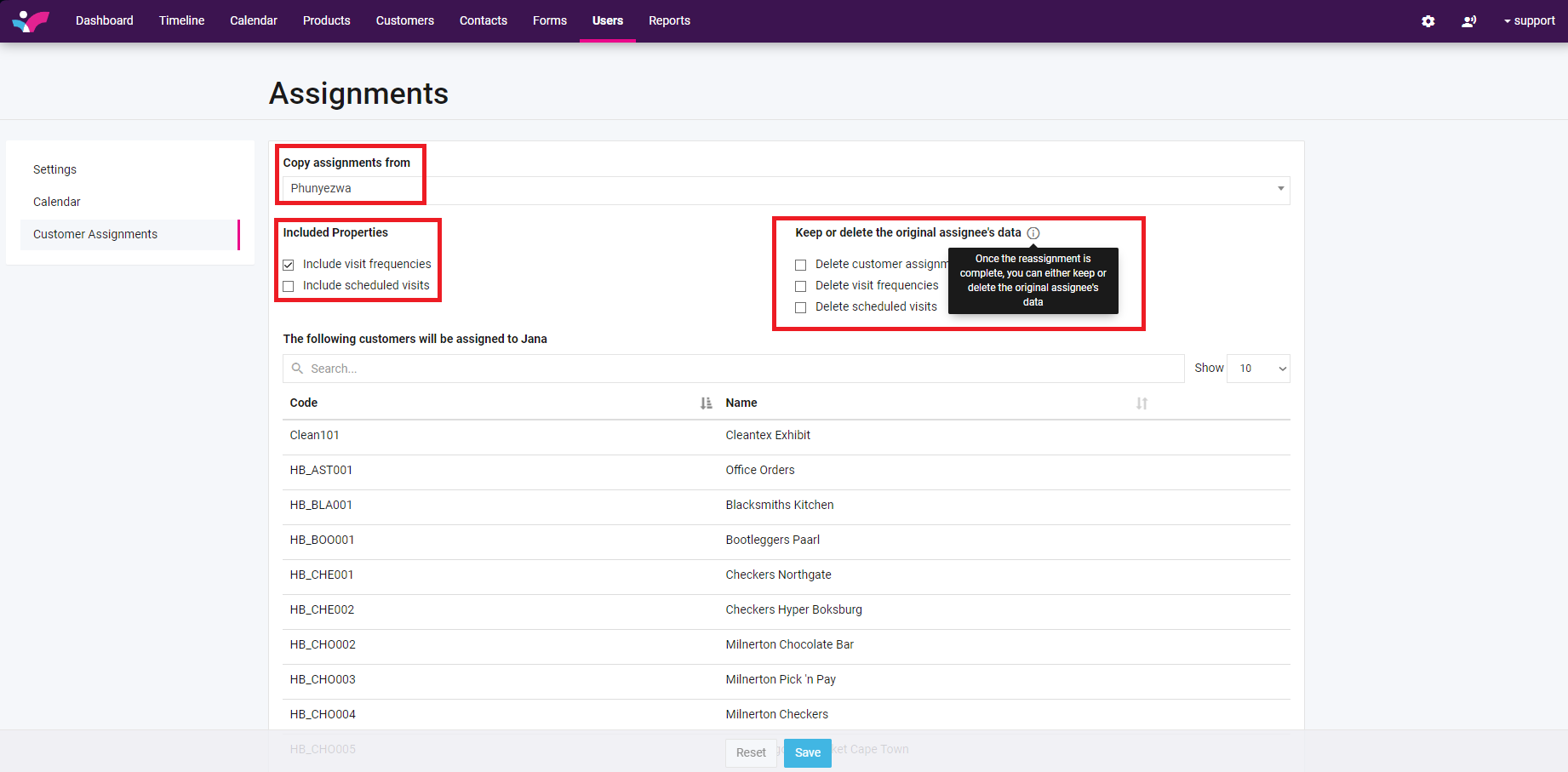 To the right you can choose if this process should remove the customer assignments, set visit frequencies or the planned visits for the original user.