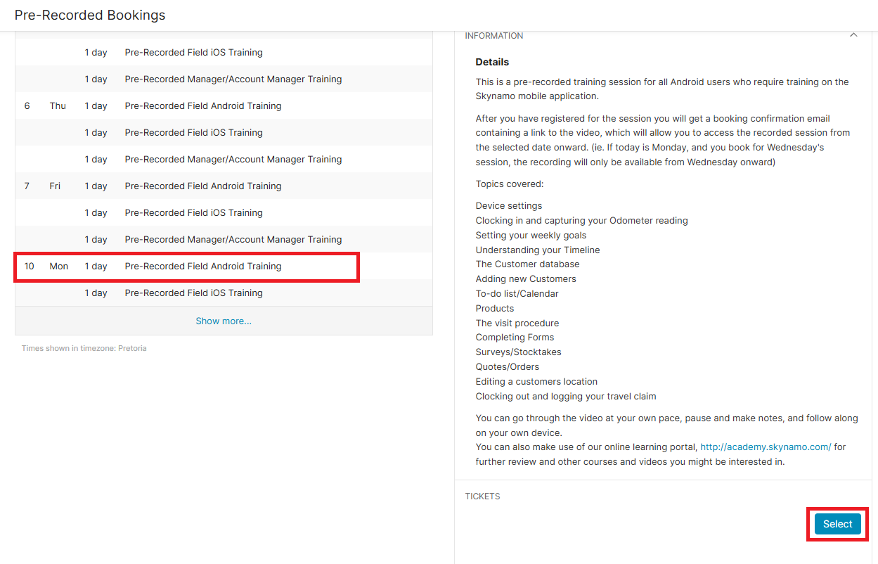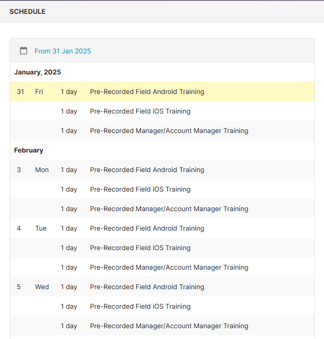 2. Under the Schedule, there will be training options for Android users, iOS users, and Admin/Managers. Regardless of which date slot you choose, you will immediately get access to the pre-recorded training video: