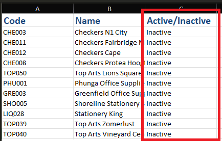 - Delete all other columns except for the Code, Name and Active/Inactive columns