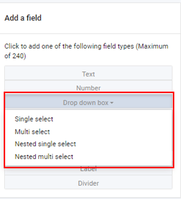 Drop Down Box – choose between single, multi, single nested or multi nested