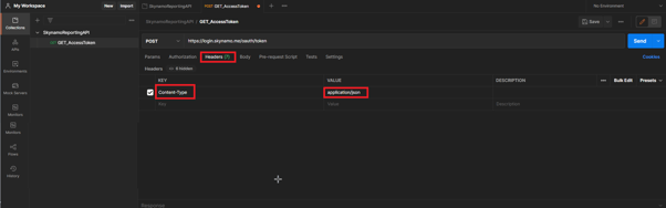 Select Headers and add the relevant KEY:Content-Type and VALUE: application/json