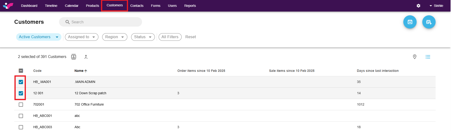 1. Click on the customer tab. Select two customers to merge by ticket the boxes next to them.