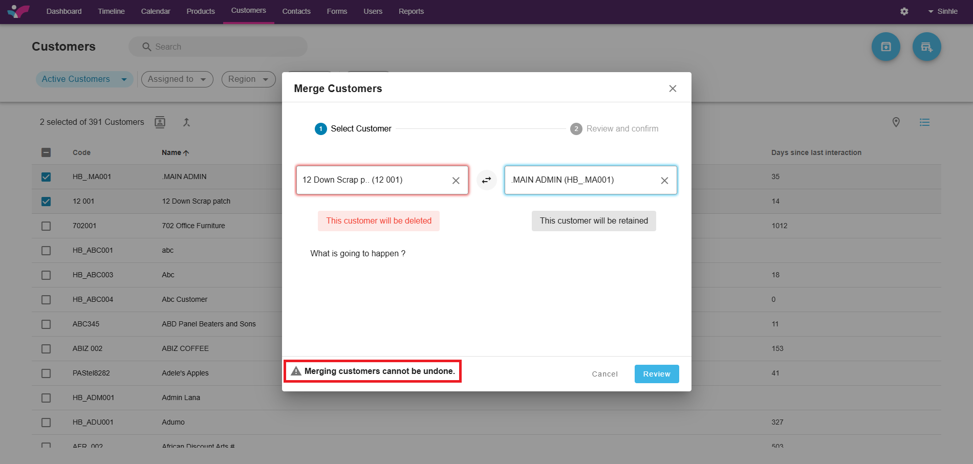 3. A block will then appear for you to select which customer you want to delete, and which one you want to retain. Please also note that merges can not be undone.