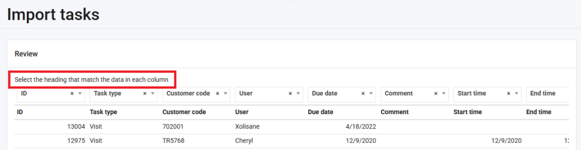 Please note: With visit frequency imports you can only have one user in the "users" column per customer, otherwise it will fail.