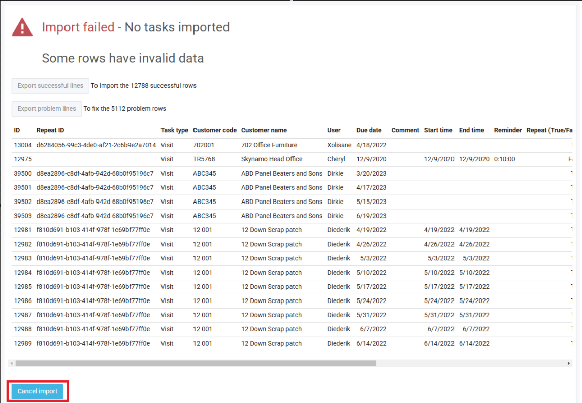 - Duplicate customers/products/tasks in file: This means you have the same product code or customer code in your file more than once.