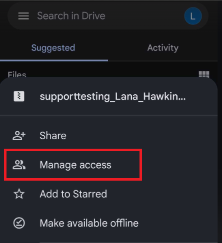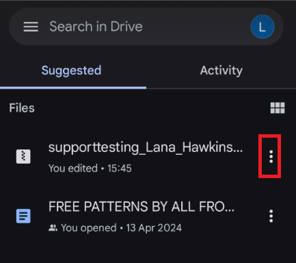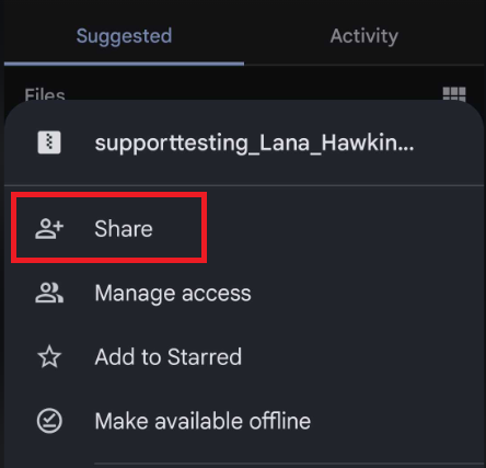 -Click on the back-arrow at the top-left corner until you get to the main Drive screen again. Click on the 3 dots again, and then click on Share: