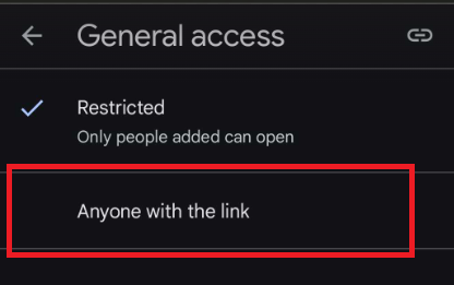 -Under Restricted, click on Change and change it to "Anyone with a link":