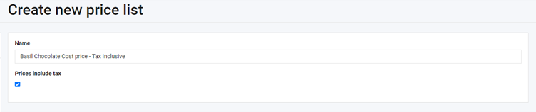 2. Add the name for your price list, possibly mentioning in the name that this is your cost pricing. Indicate if this pricelist includes or excludes tax, and this should match the option for your other prices. You can amend this later if needed.