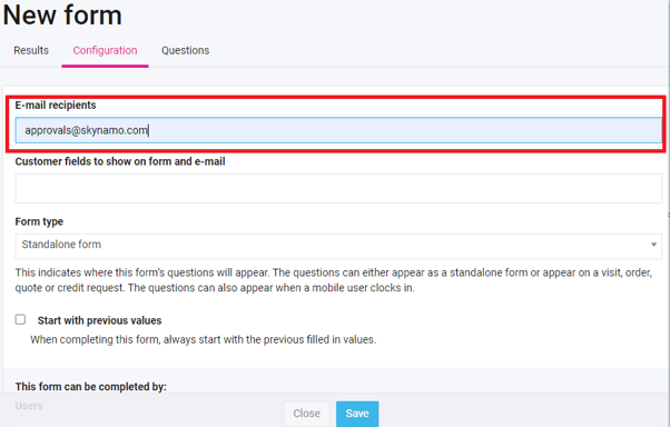 - When you opened the configuration tab, add the approvals email of Skynamo - approvals@skynamo.com. This is the email that Skynamo will use to send the form to their intended recipients for approval. When you are done, save the changes.