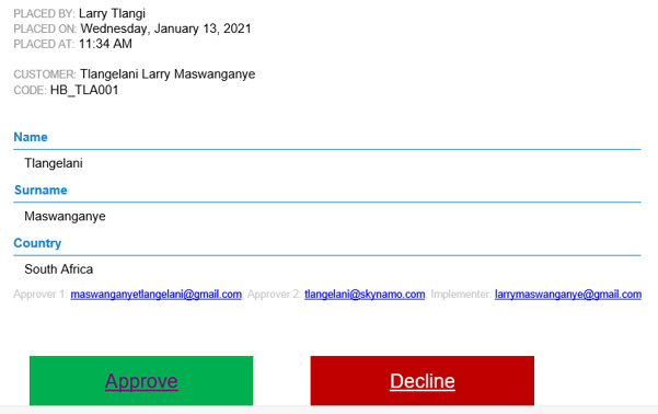 - If the form has been approved, the user who initially filled in the form, will receive an email stating "Request approved by approver_email_address" notifying him/her that the form was approved or declined.