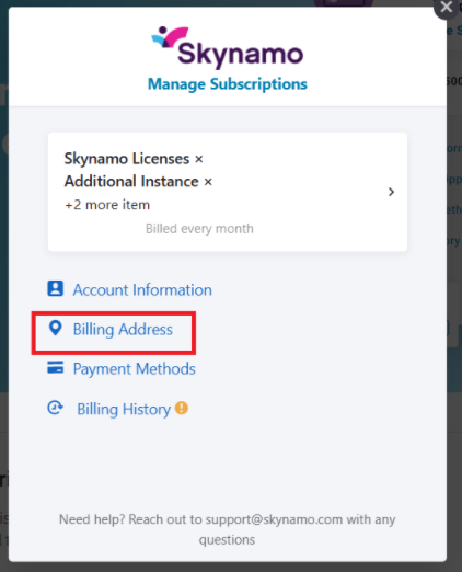 - At the top, you will be able to see your Skynamo licenses, additional instances, additional add-ons, and how much you are billed each month (Please note that sensitive information was not included in the below screenshot):
