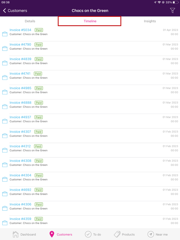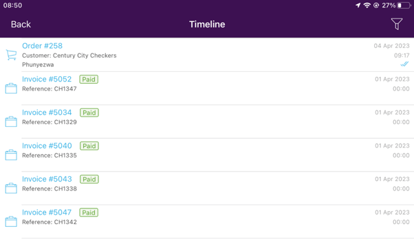 Field users will be able to see the invoice status on the main Timeline and on the Customer Profile Timeline.