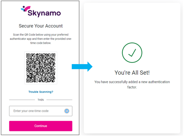Use your authentication app to scan the QR code displayed on your screen and enter the time-based one-time code provided.
