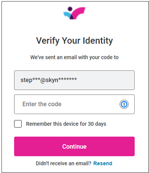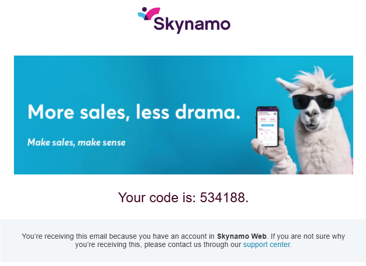 The one email will contain the code you’ll need to access your Skynamo account. You will need to enter this code in the block requesting you to verify your Identity, as seen in the image further down.
