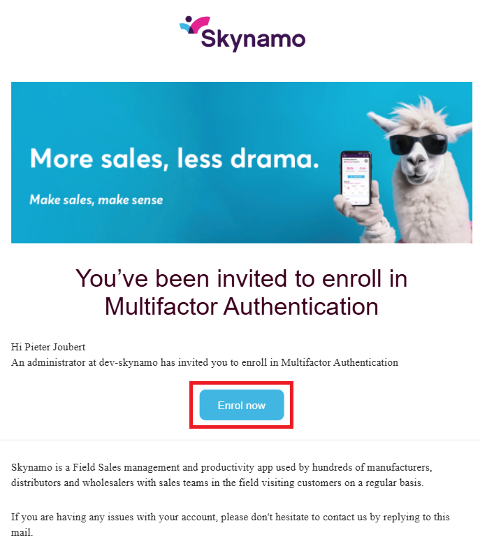 After enabling MFA as shown in Step 2, you (and all your users) will receive two emails from Skynamo when you attempt to log in again.