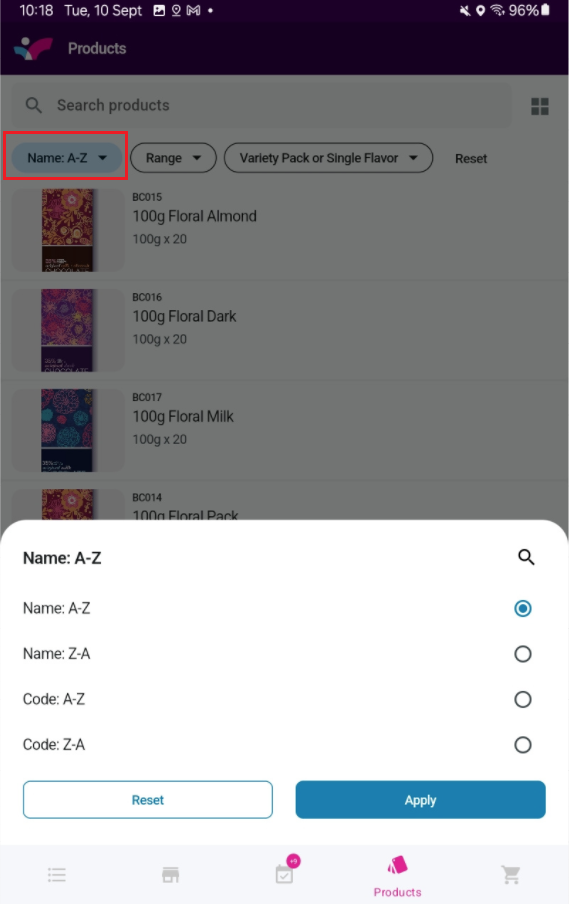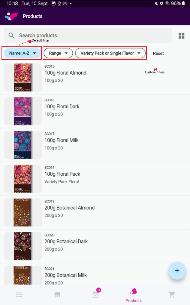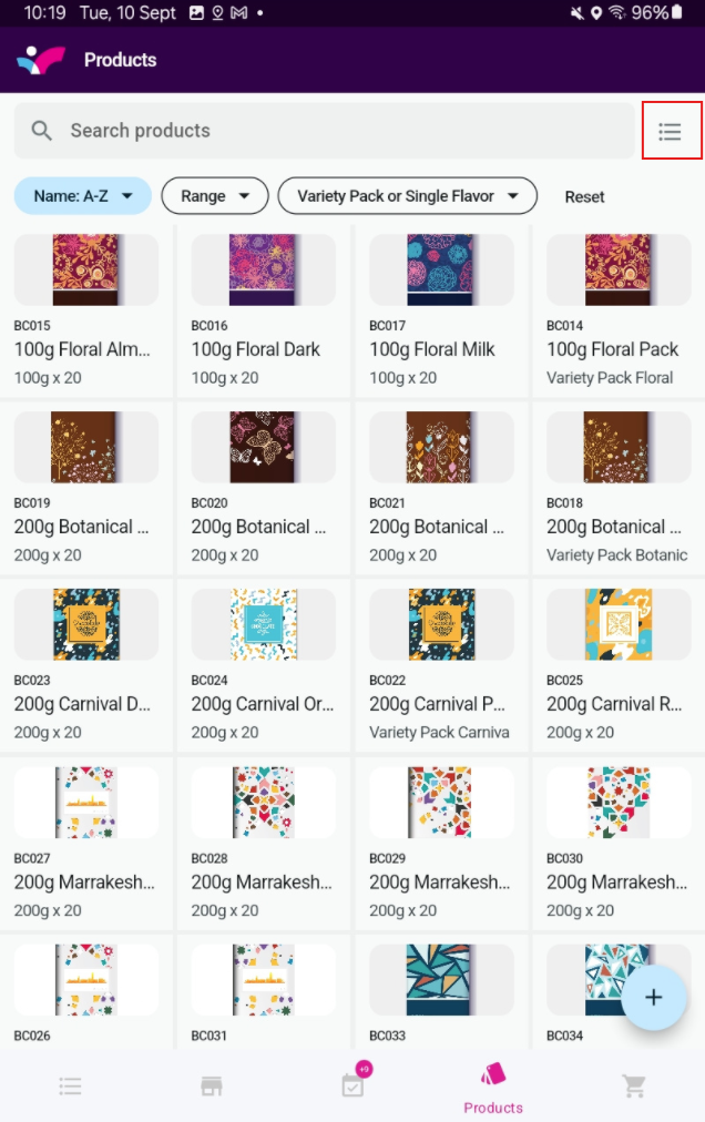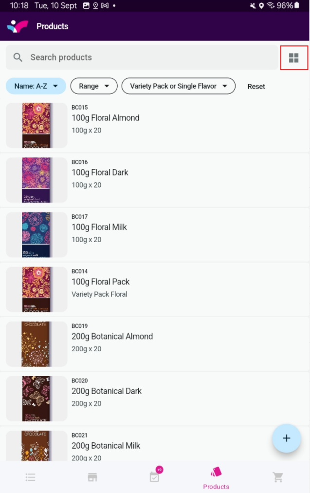 Tap on the plus sign at the bottom right of the products page to start an order or a quote