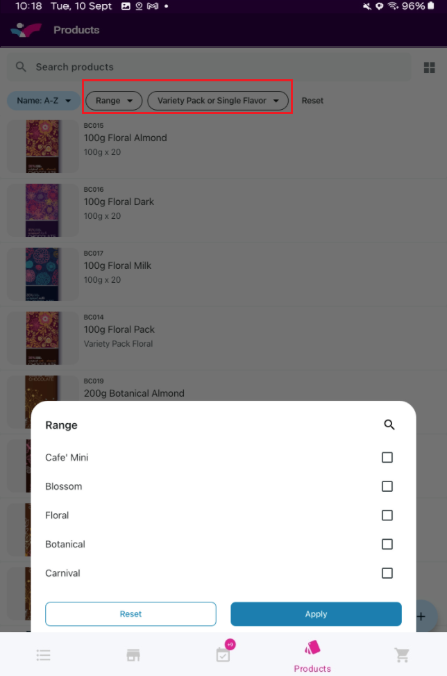 The "Products" tab allows you access to the entire products list, providing real-time inventory information. You also have the option of filtering the products using the default filters or the custom filters.