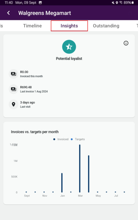 Finally, next to the “Insights” tab is the “Outstanding” tab. On this page, you will be able to see the ordered items that are outstanding, their quantity and total value.