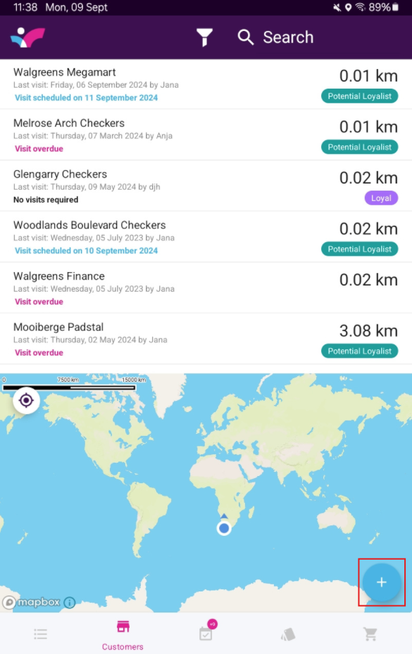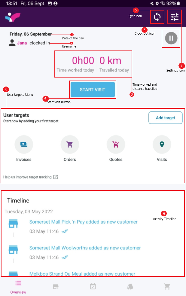 - Start visit button: Tap here to begin a customer visit