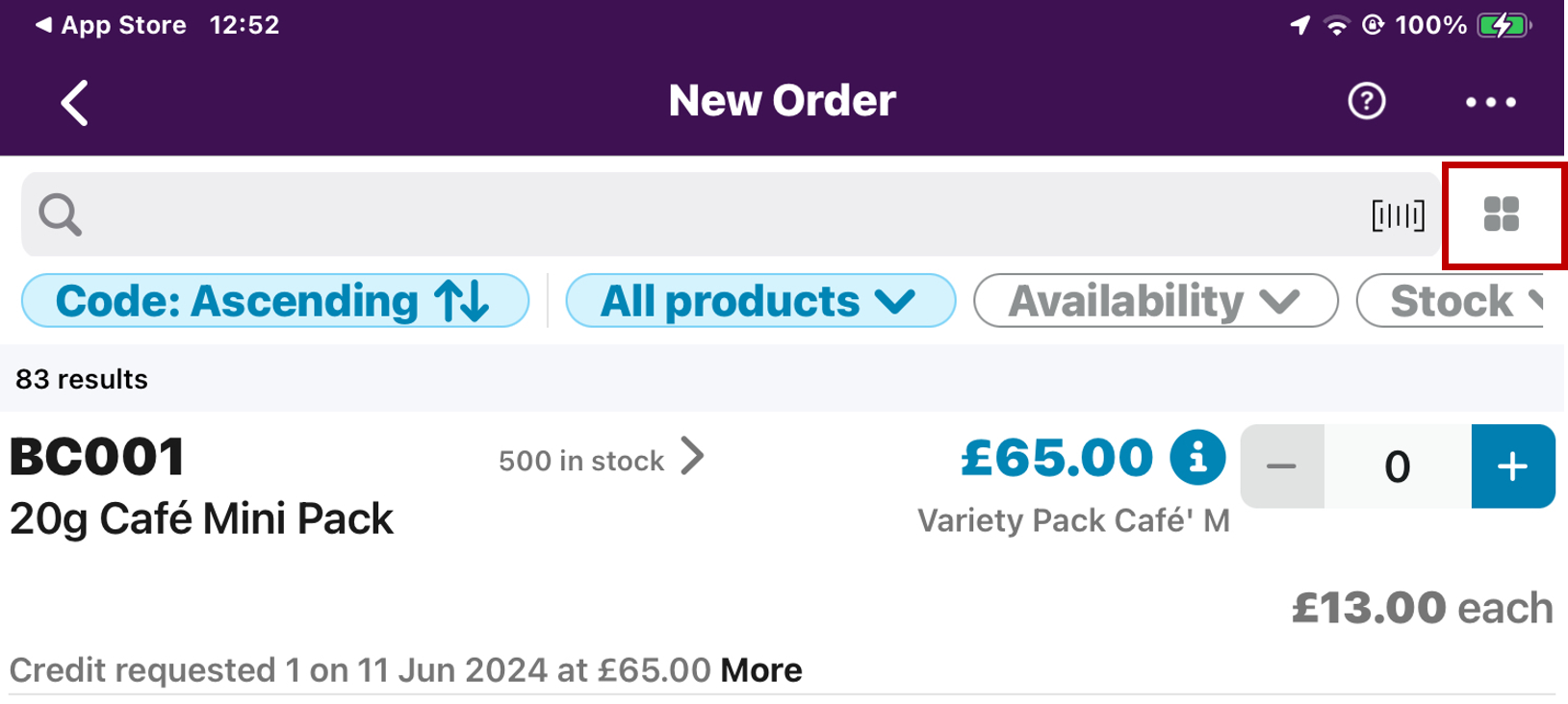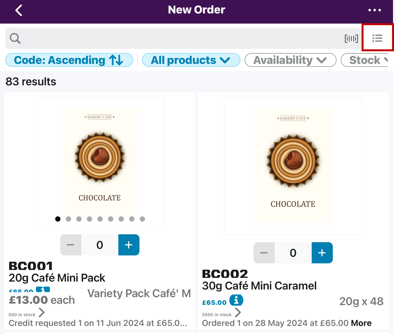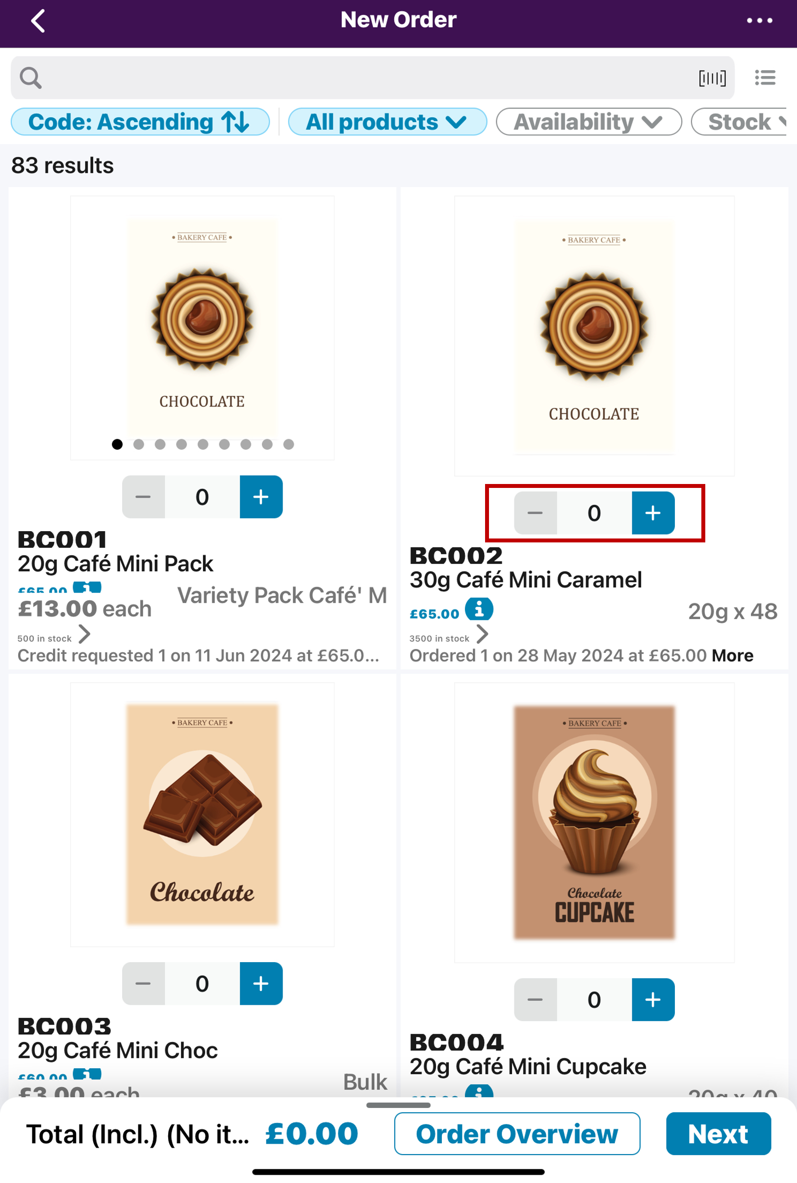 This will take you to the catalogue view, displaying your product images, details, pricing and stock level. Click on any of the images to enlarge them. You can also add quantities from here by clicking on the quantity block like we did earlier, or selecting the blue +.