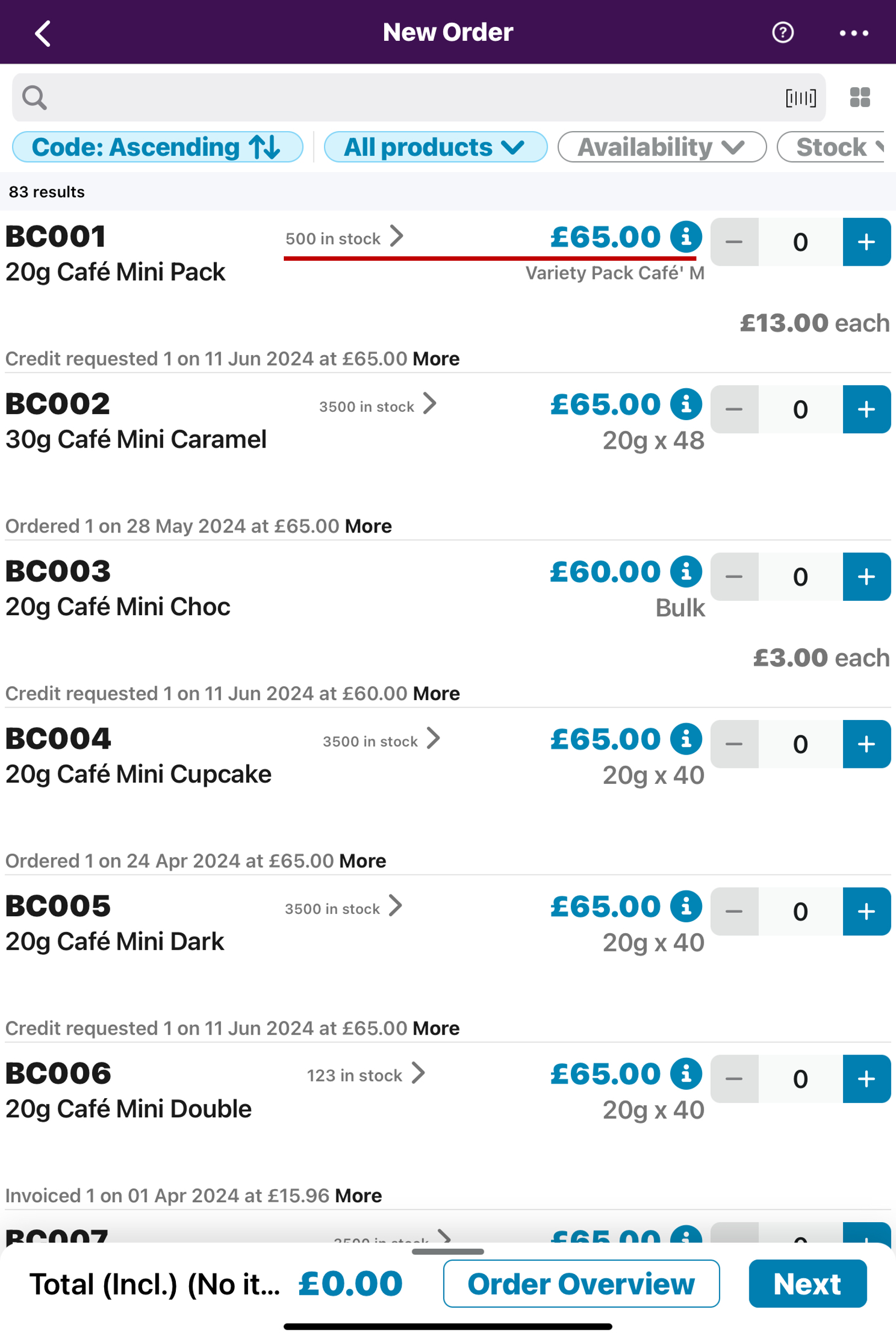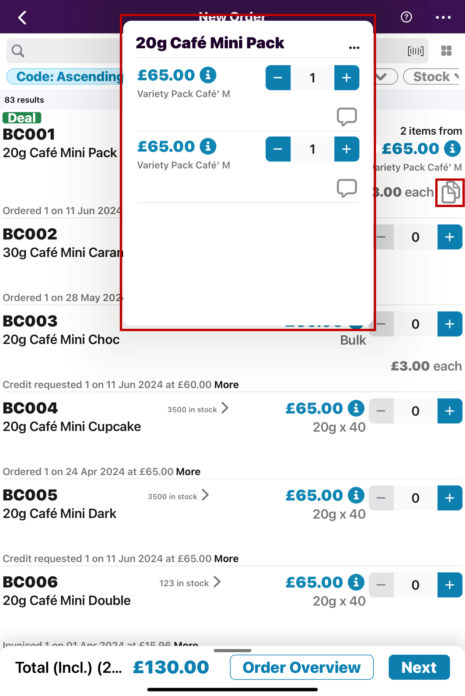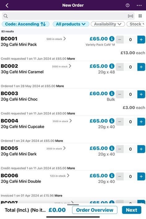 This will take you to the catalogue view, displaying your product images, details, pricing and stock level. Click on any of the images to enlarge them. You can also add quantities from here by clicking on the quantity block like we did earlier, or selecting the blue +.