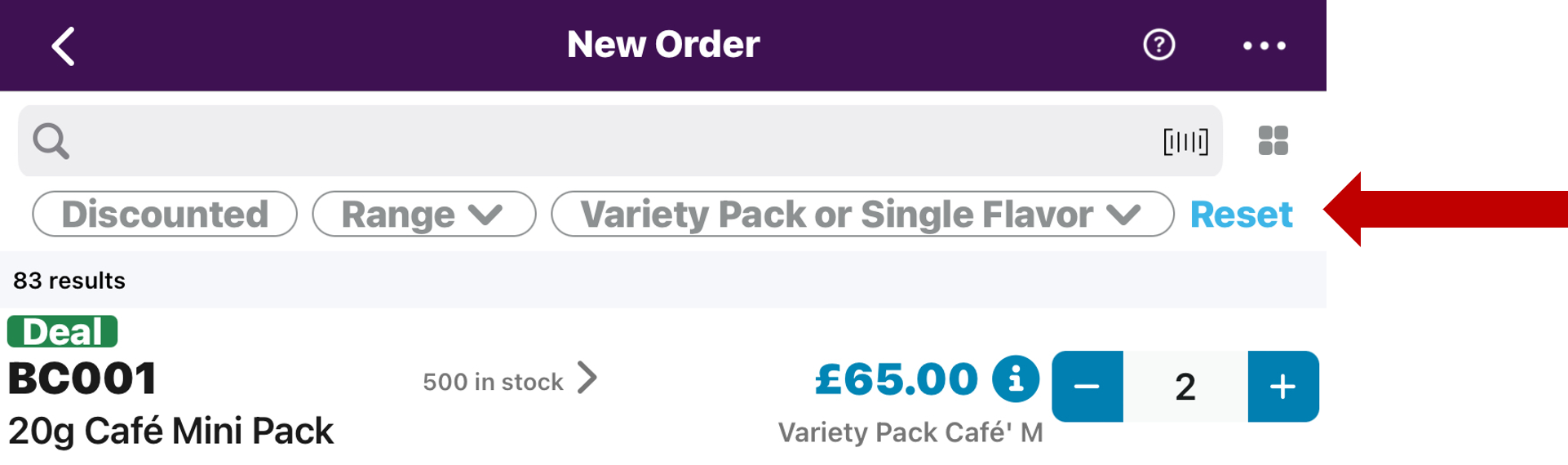 Once you have chosen a filter you will only see the relevant products on the list. If the following message is displayed, there are no products matching the chosen filter(s). You can either deselect some filters or remove all current filter options by selecting the “Reset Filters” button.