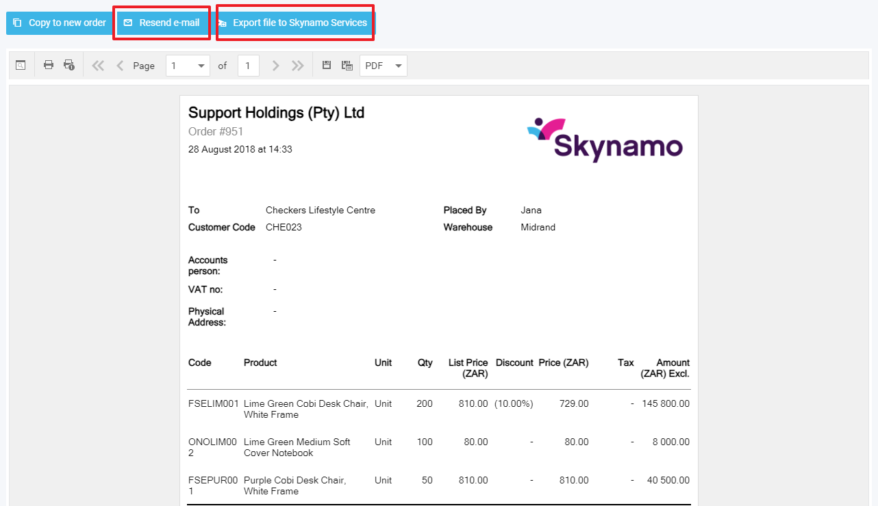 Once you have the full order open click either the "Resend e-mail" or "Export file to Skynamo Services" button. Both options will trigger the reintegration of the order. However, if you choose "Resend e-mail," it will also resend the email to all previously listed recipients of the order. If you prefer not to resend the email, please select "Export file to Skynamo Services."