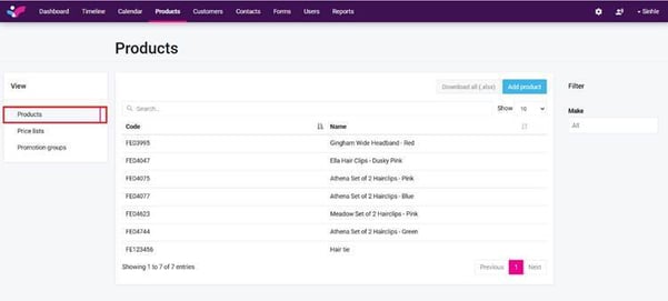 The products tab allows the following to take place: