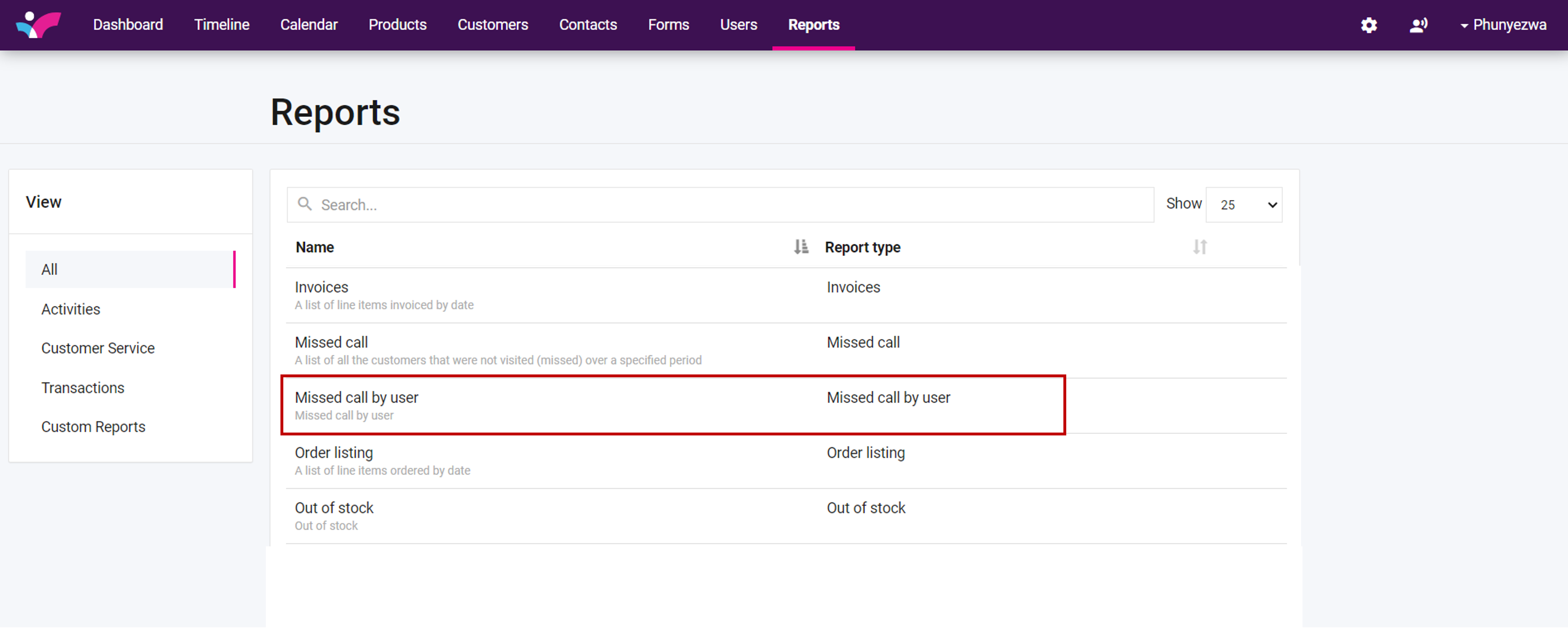 Step 1: Select the Reports tab from the top bar. Select the Missed call by user Report from the list.