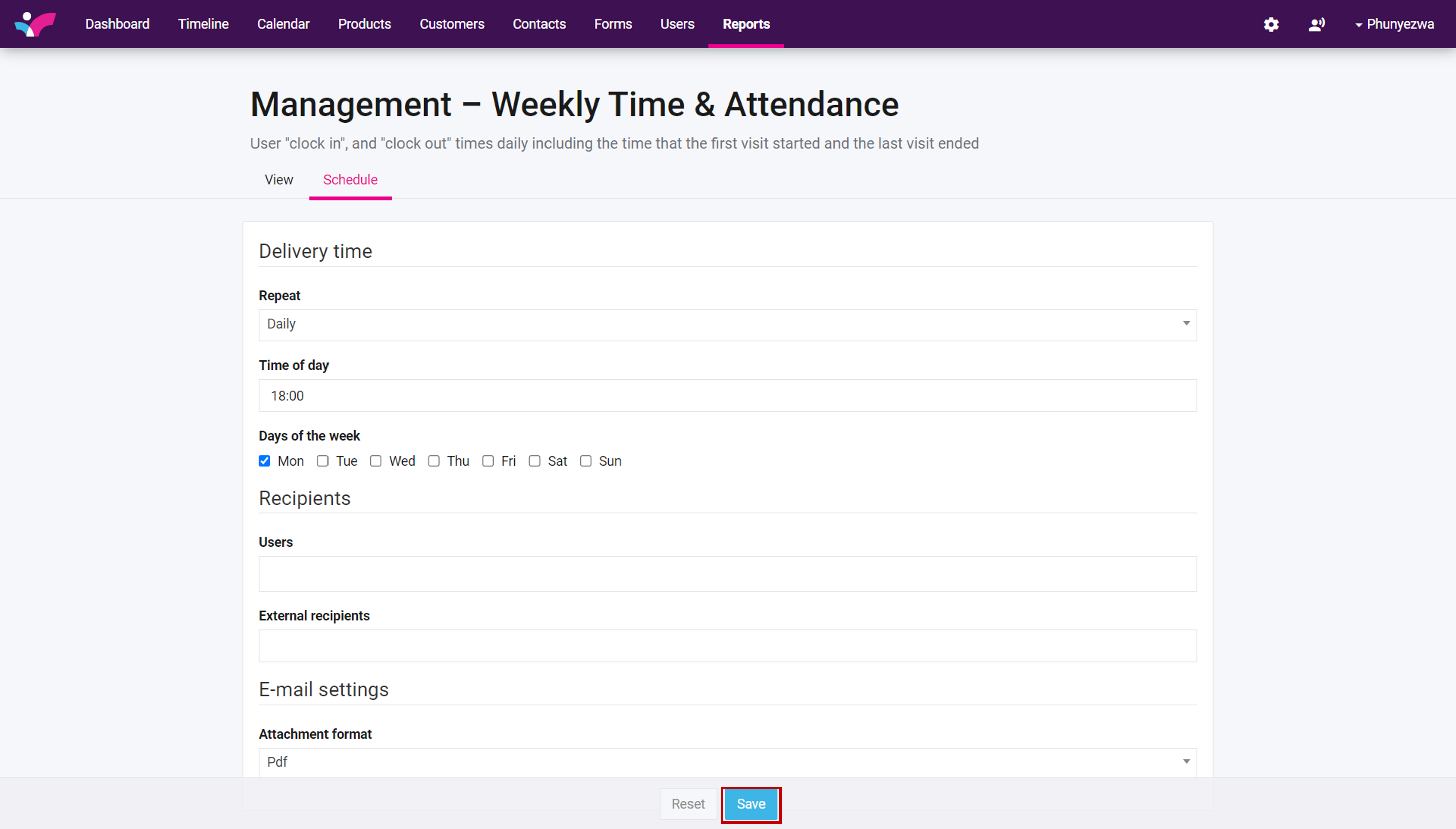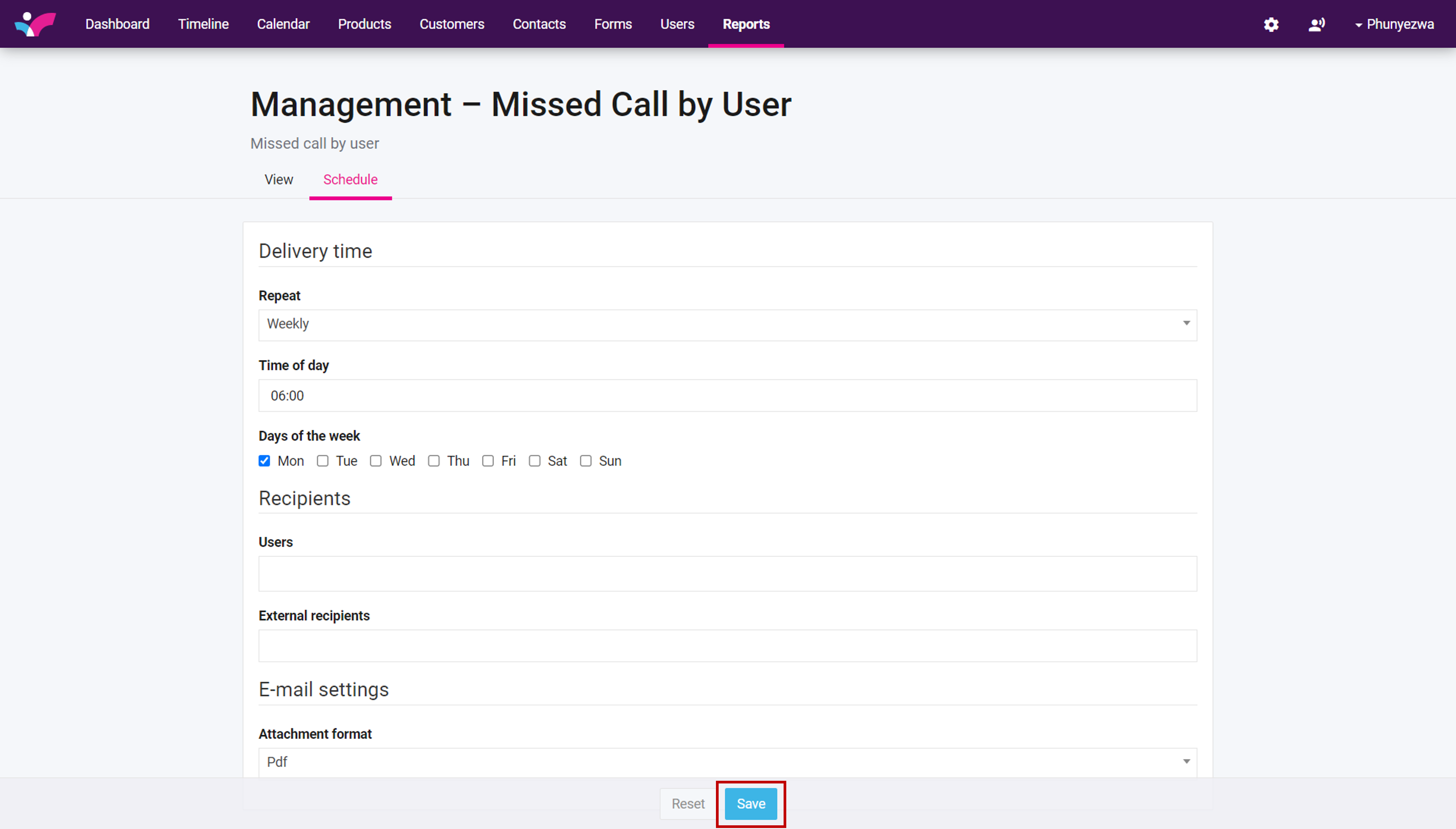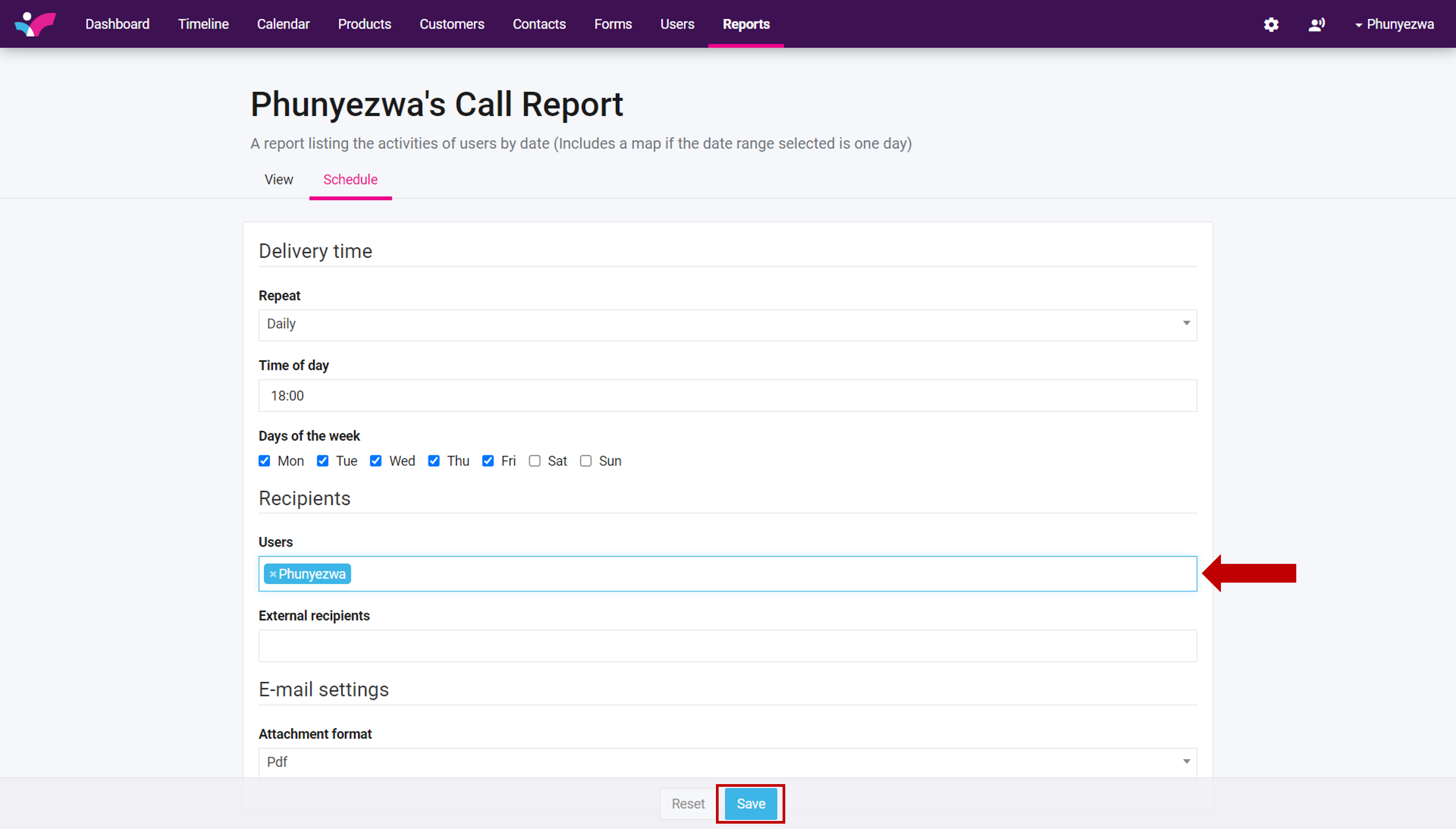 - If you are setting this report up for a specific user only remember to add their name in the users block under recipients, to send them a copy of this report.