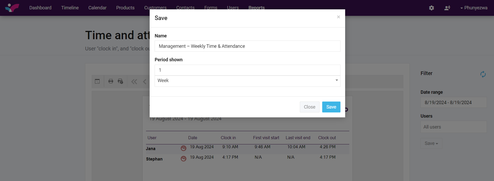 Step 3: Select “Save”, “Save Report As”, Change the name to “Management – Weekly Time & Attendance”, and ensure the “Period Shown” is set for 1 week.