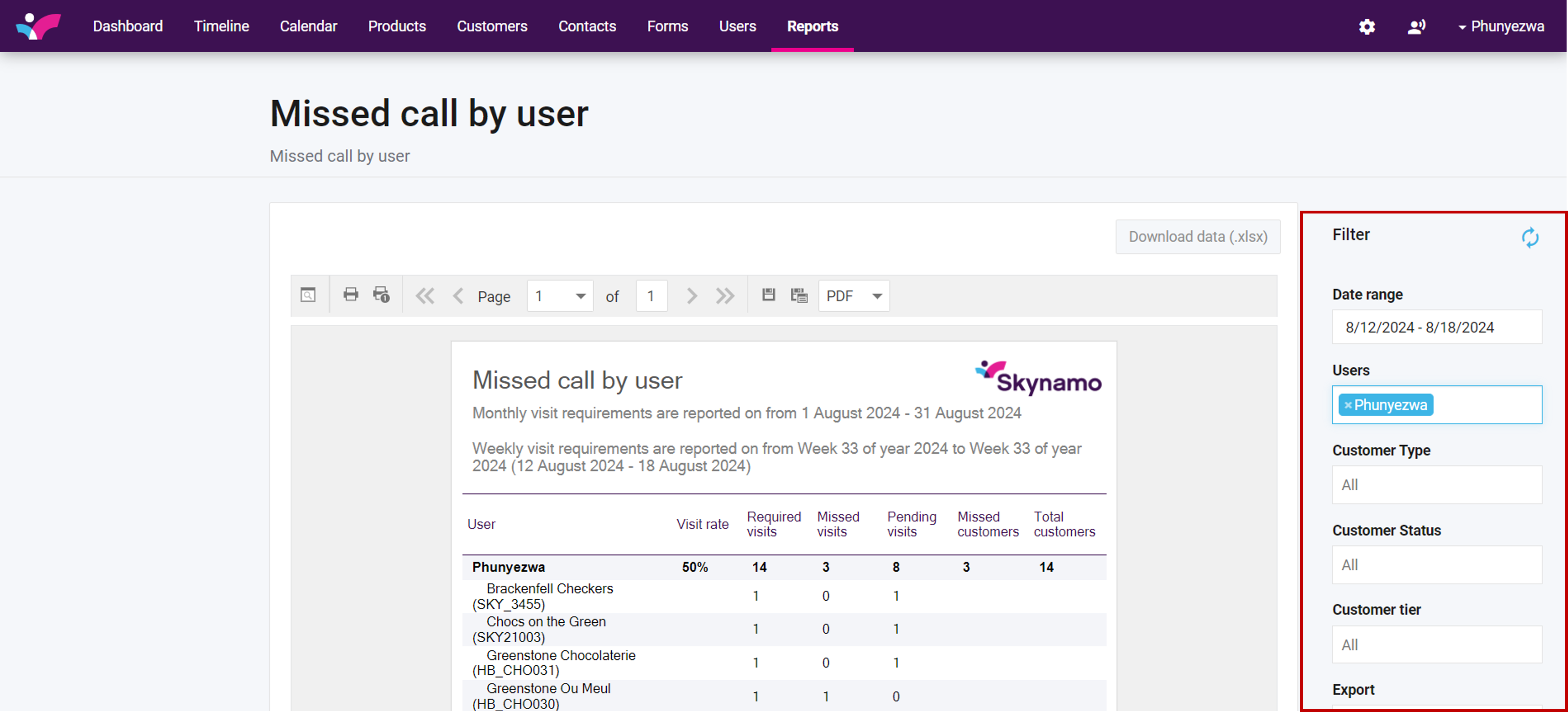 - Missed Call by User Report (Management – if you are using visit frequencies)