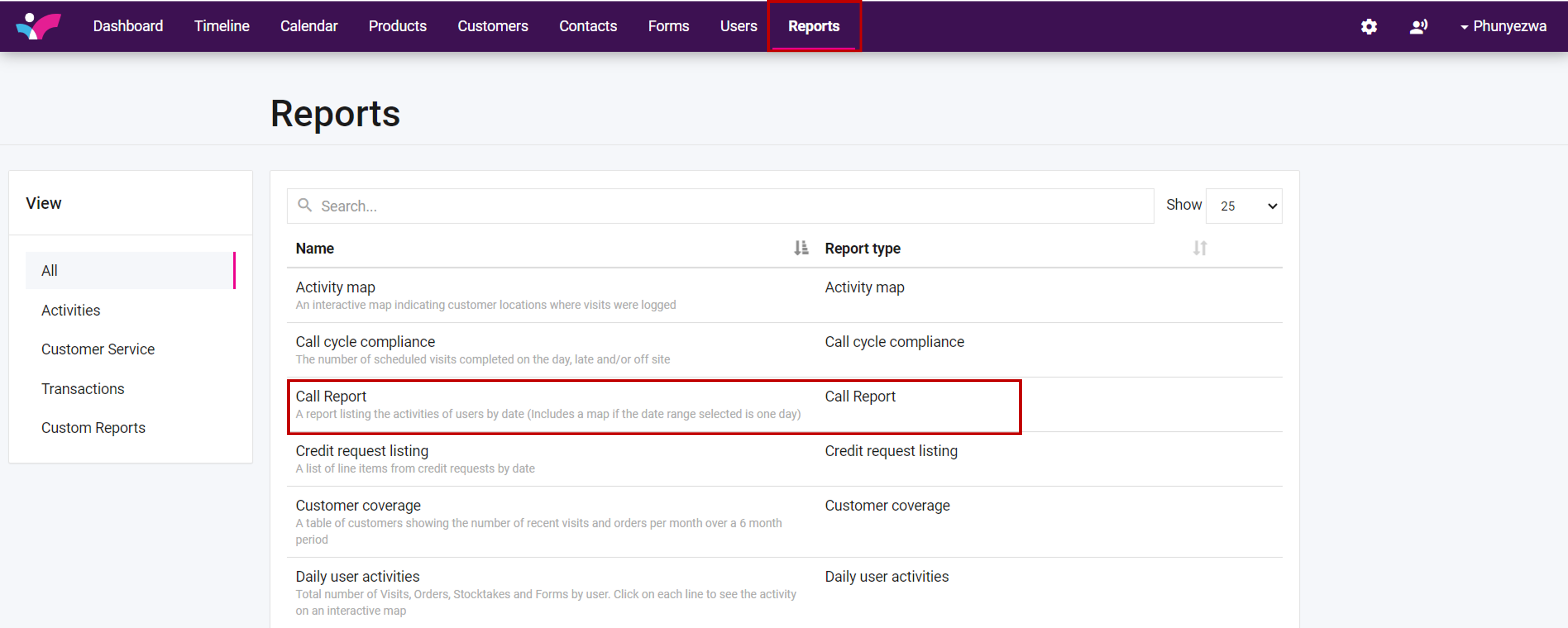Step 1: Select the Reports tab from the top bar. Select the Call Report from the list.
