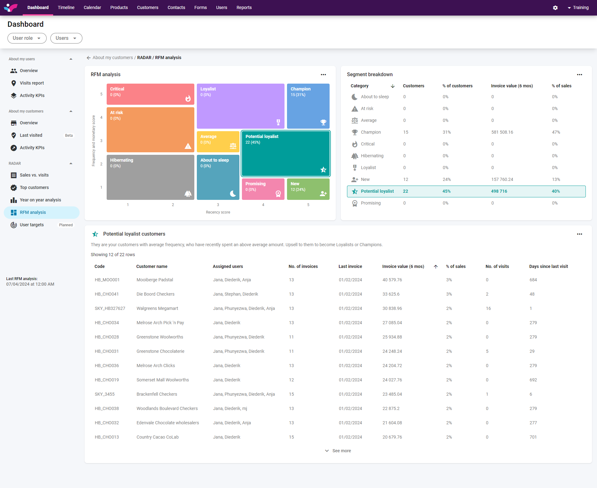 The RFM Analysis page, shown below, provides a visual of the categories using a treemap chart and contains two data tables - a segment breakdown per category and a detailed list of customers and their order history within a selected category: