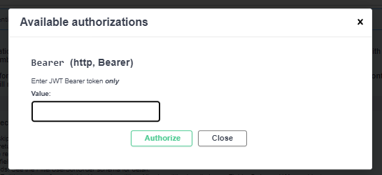 Click on Authorize and use the access token generated from POSTMAN and enter it in the value box and click on Authorize again and close.