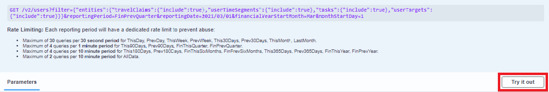 Expand the Users box and scroll down to Parameters and click on Try it out.