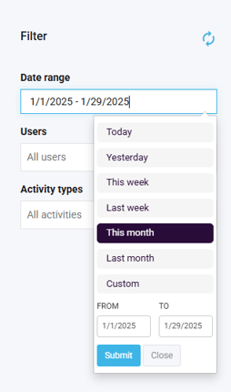 2. Specific time periods, such as today, this week, last week, this month and last month can be selected and the page will load activities for the selected timeframe. For custom date range select the From and To dates and click submit.
