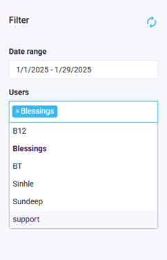 3. Click on the Users drop down to view the list of users that can be selected. Once a user is selected the page loads with activities or visits associated with selected user. Multiple users can be selected.
