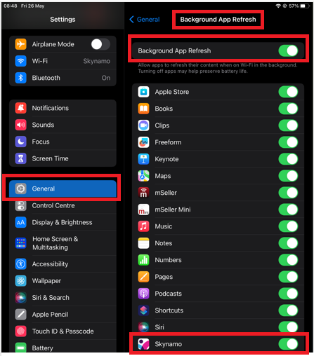 -Settings > Skynamo > Background app refresh ON